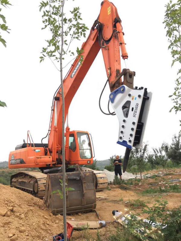 石塊一旦擊碎后應立即停止錘擊.若持續空擊,螺栓會松動或斷裂,甚至挖掘機、裝載機也會受到不利的影響.當破碎錘擊穿力不當或把鋼釬用作撬桿時,會產生空擊現象.(破碎錘空擊時錘擊時聲音會改變)